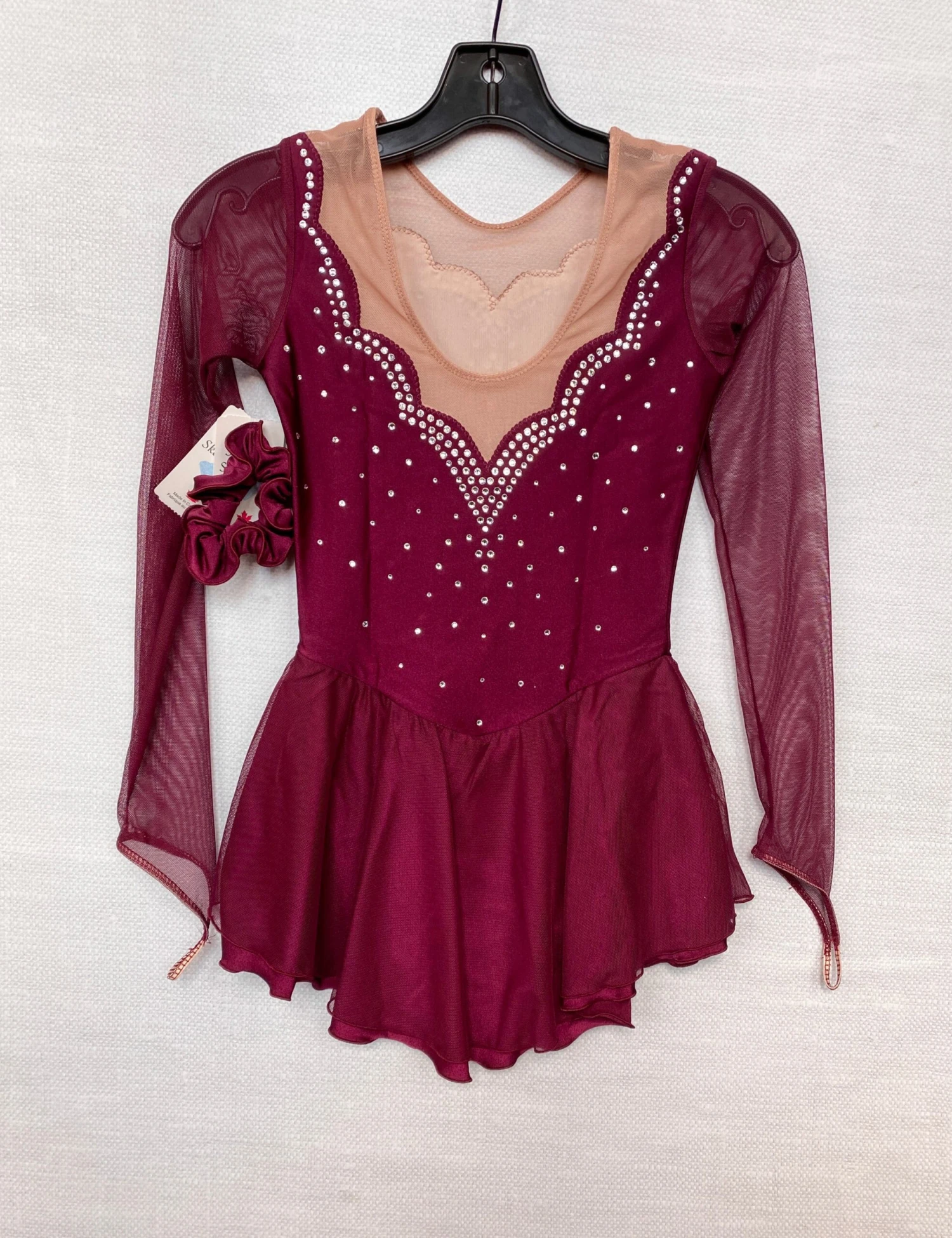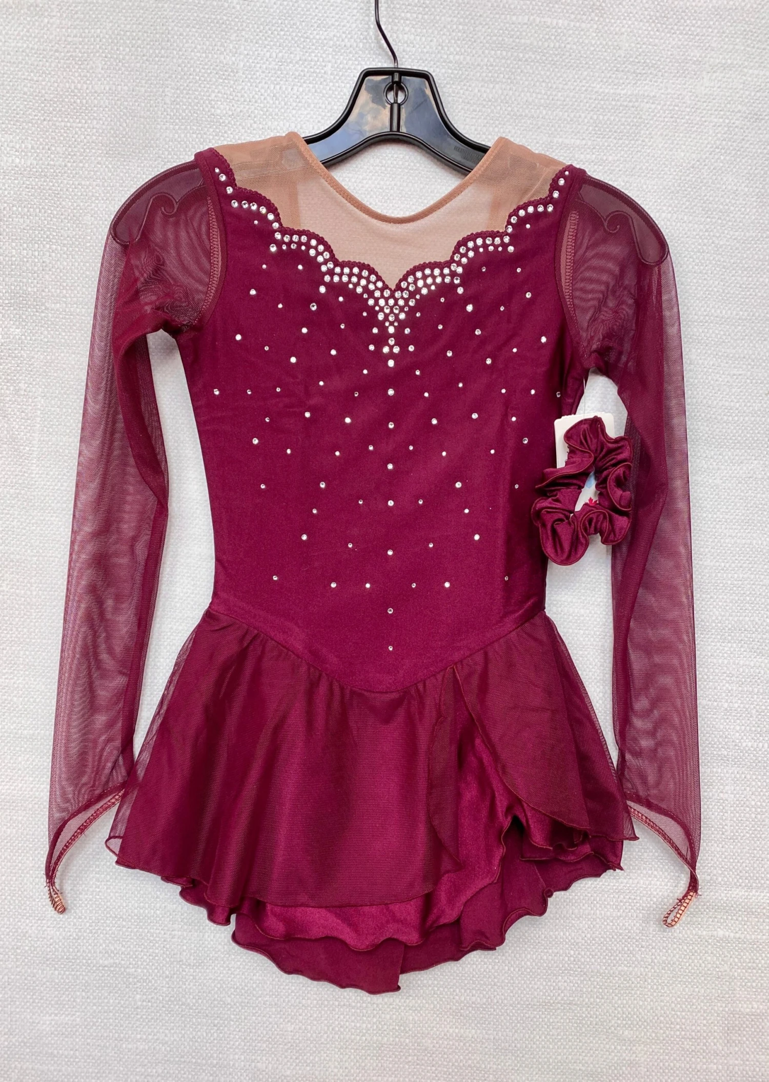 Burgundy lycra skating dress. Mesh sleeves with finger points. Mesh over lycra skirt. Scalloped sweetheart neckline front and back. Beaded with clear crystals. Lined.