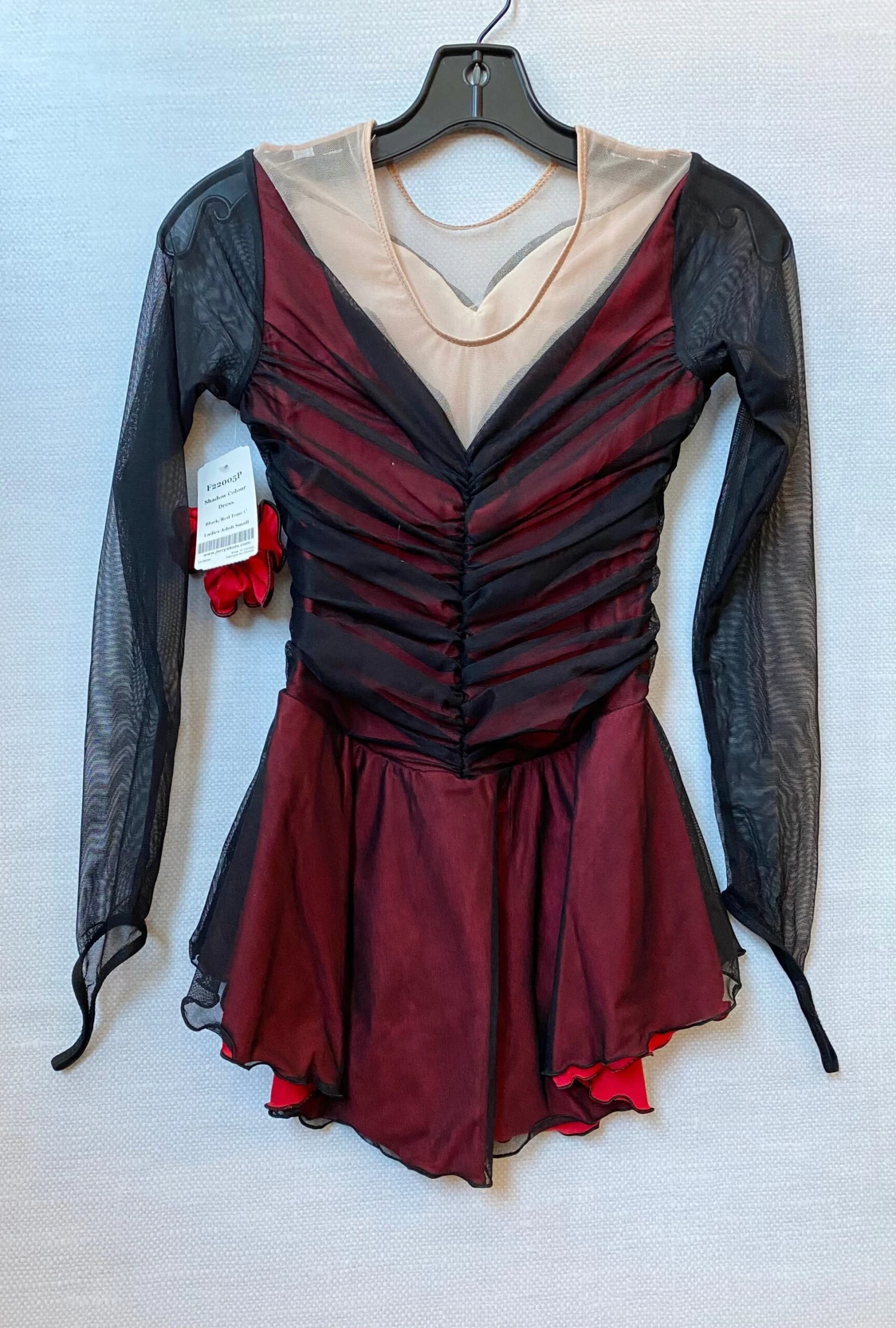 Black mesh over red lycra bodice and underskirt, Long sleeves with finger points, Â