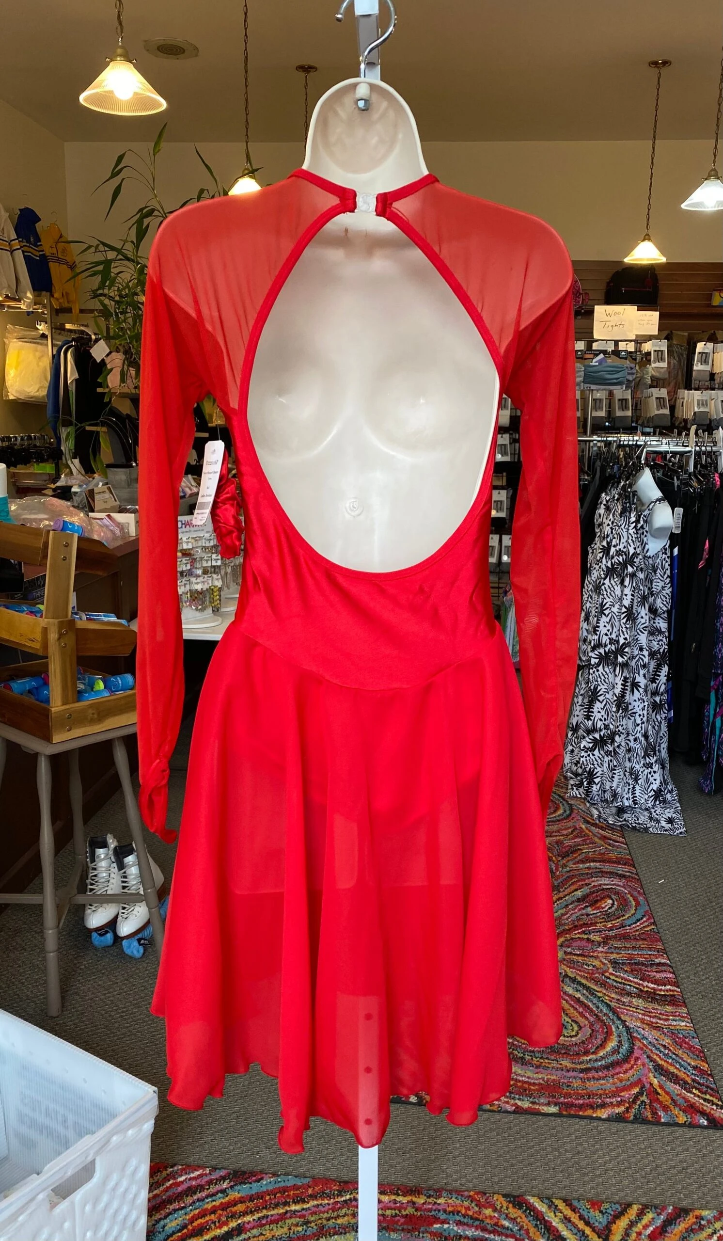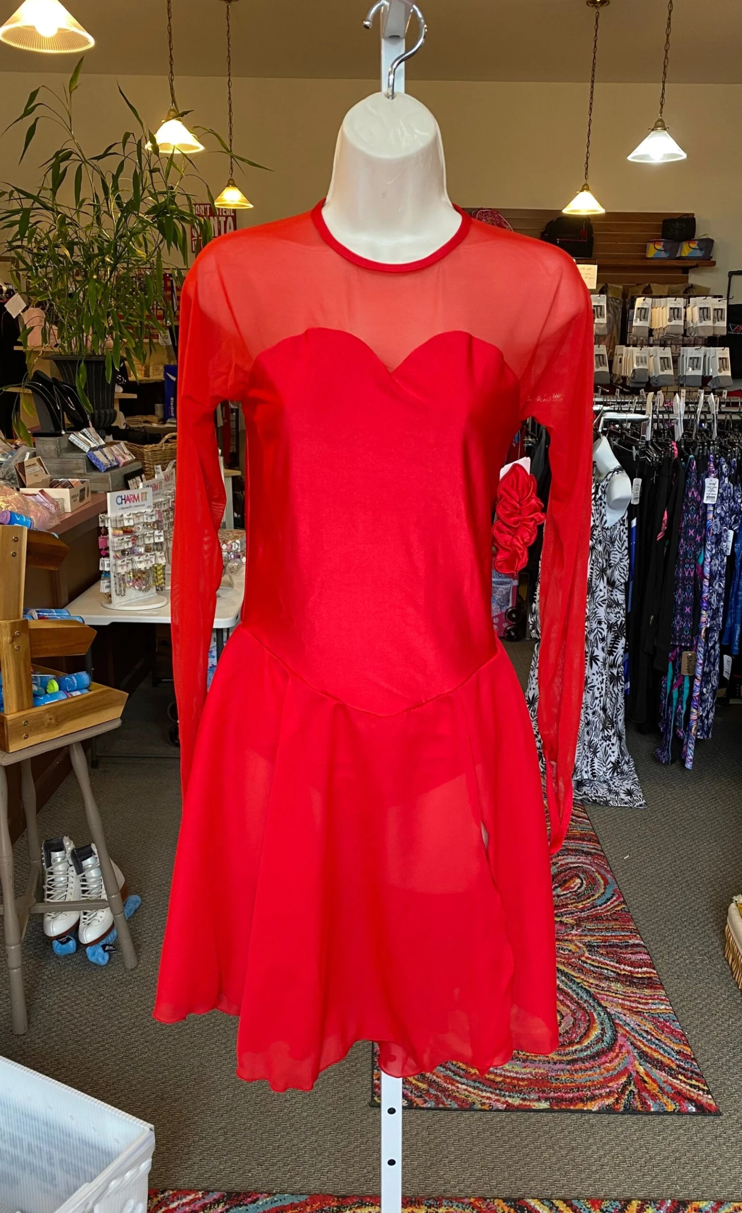 Lycra bodice skating dress, dance length single layer georgette skirt, long mesh sleeves with finger points, lined.