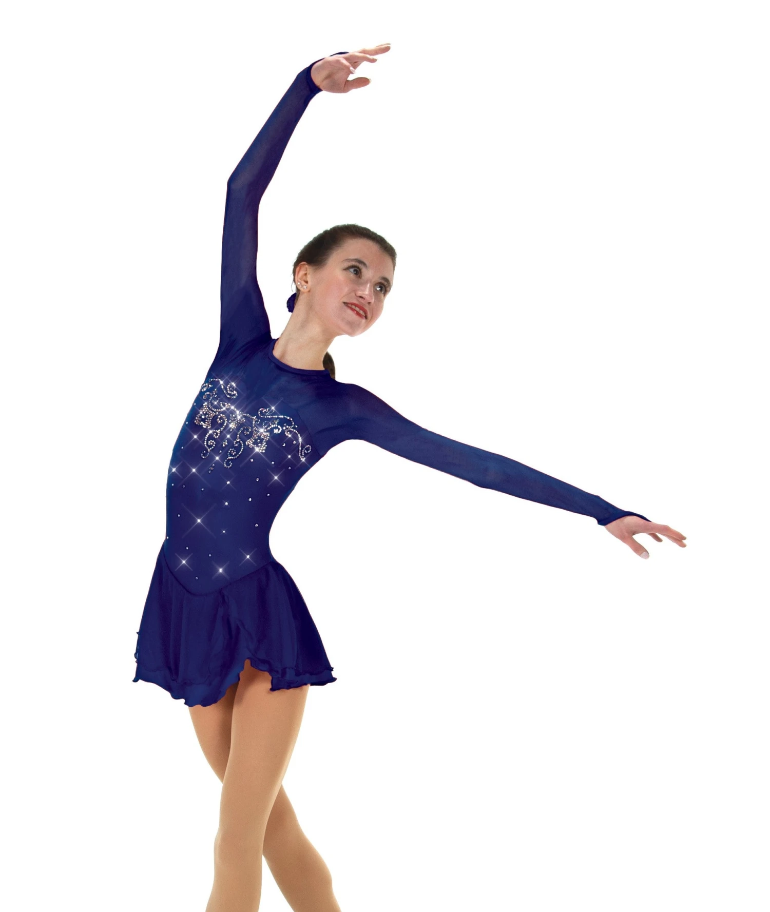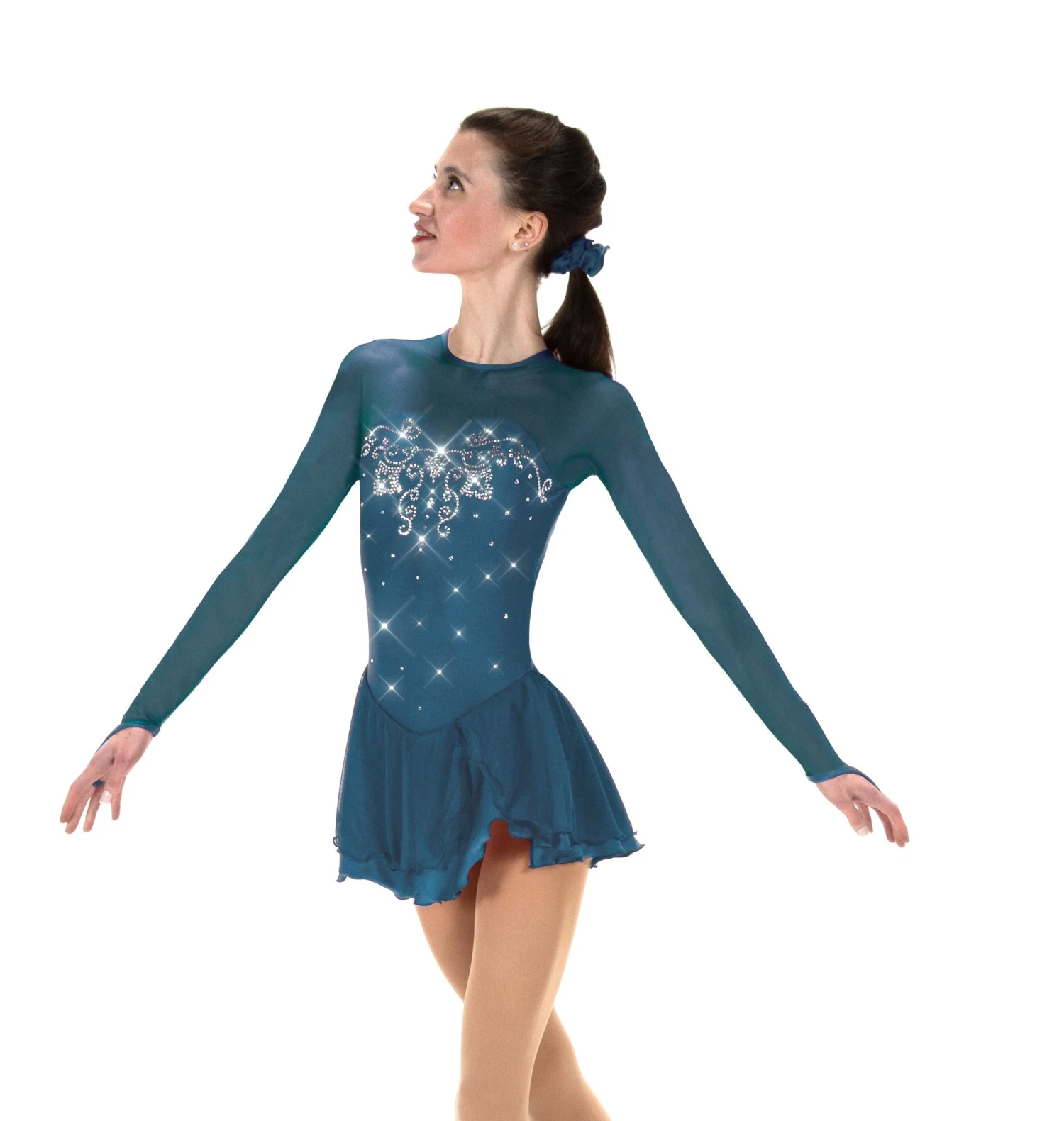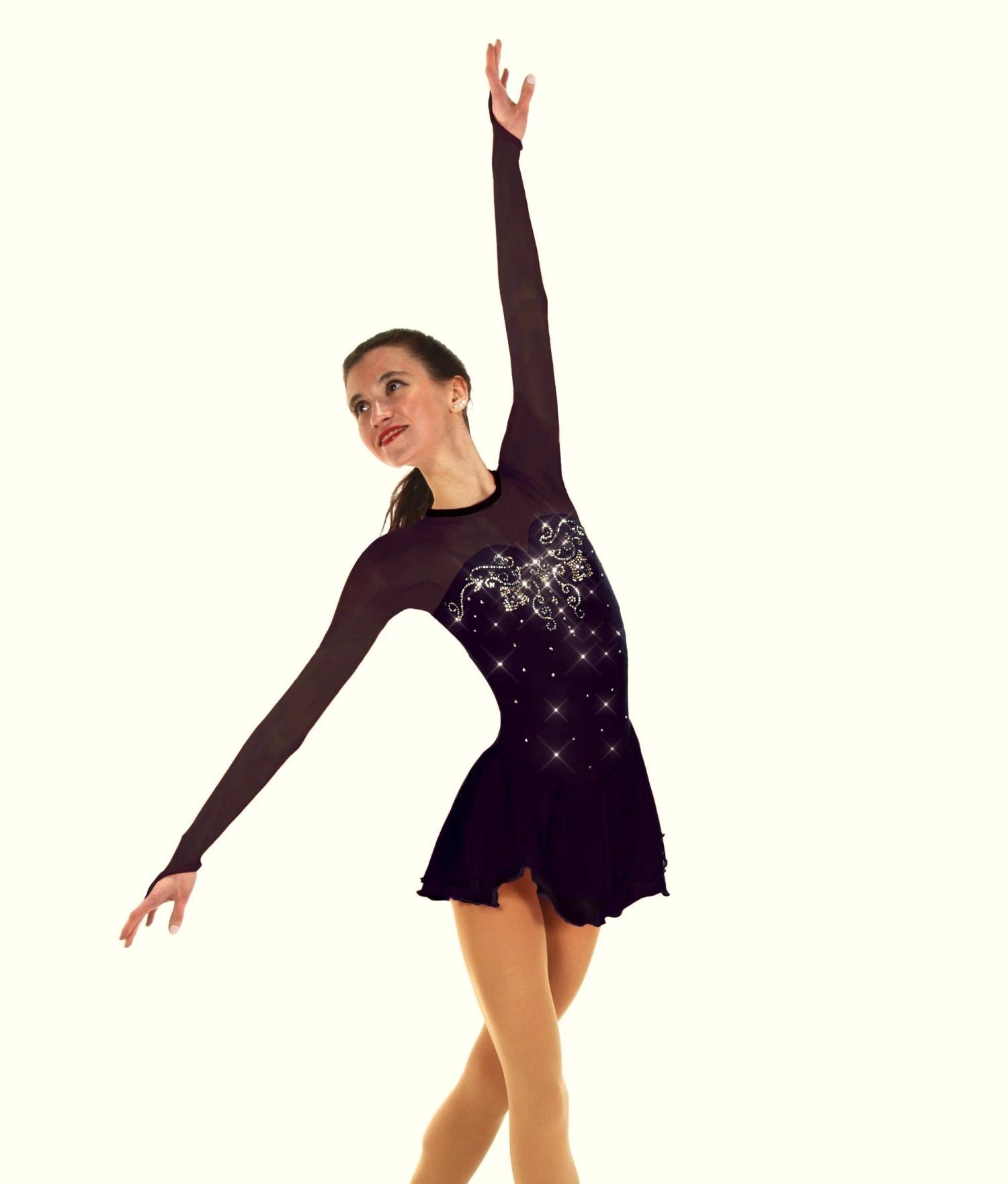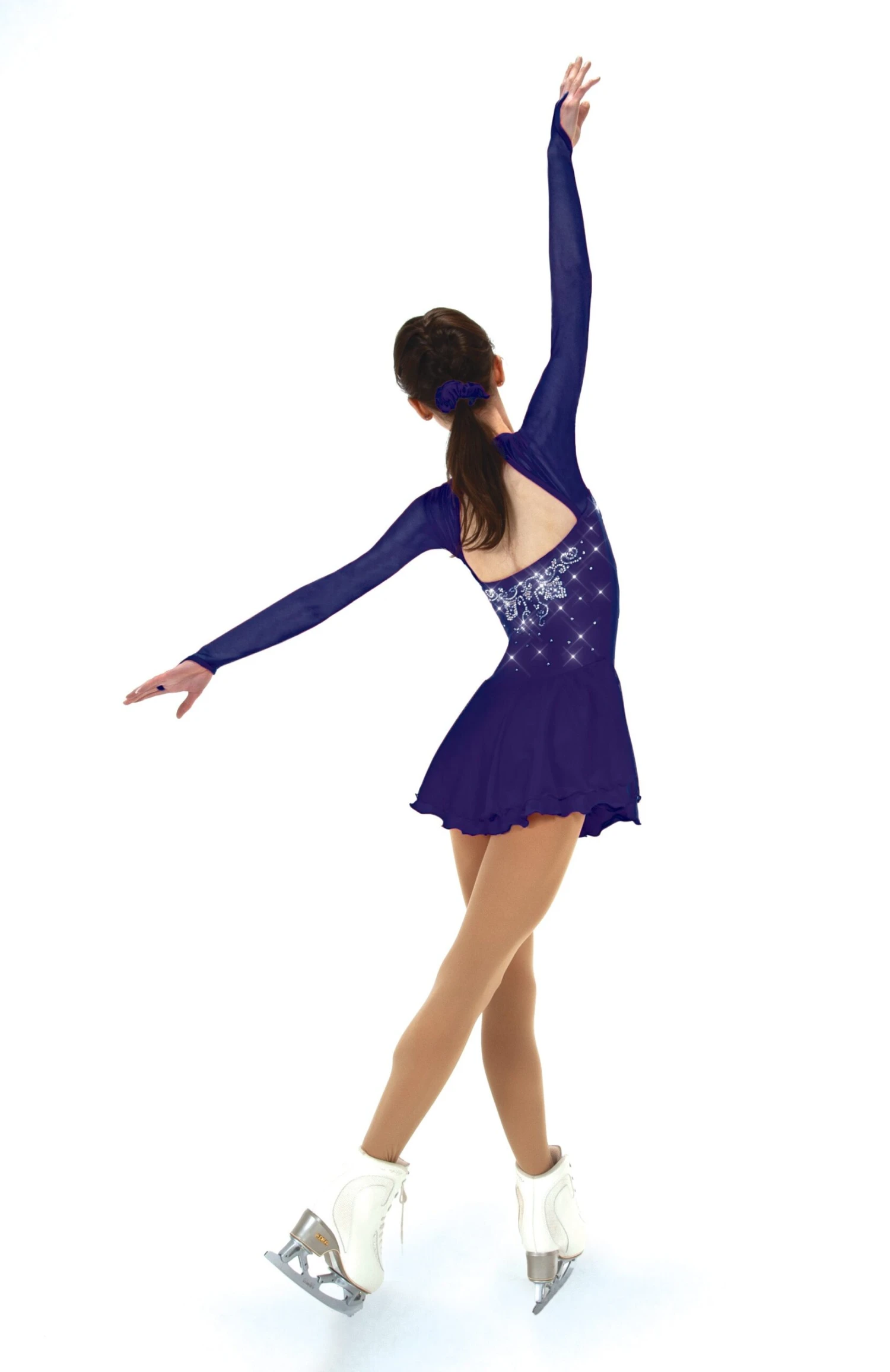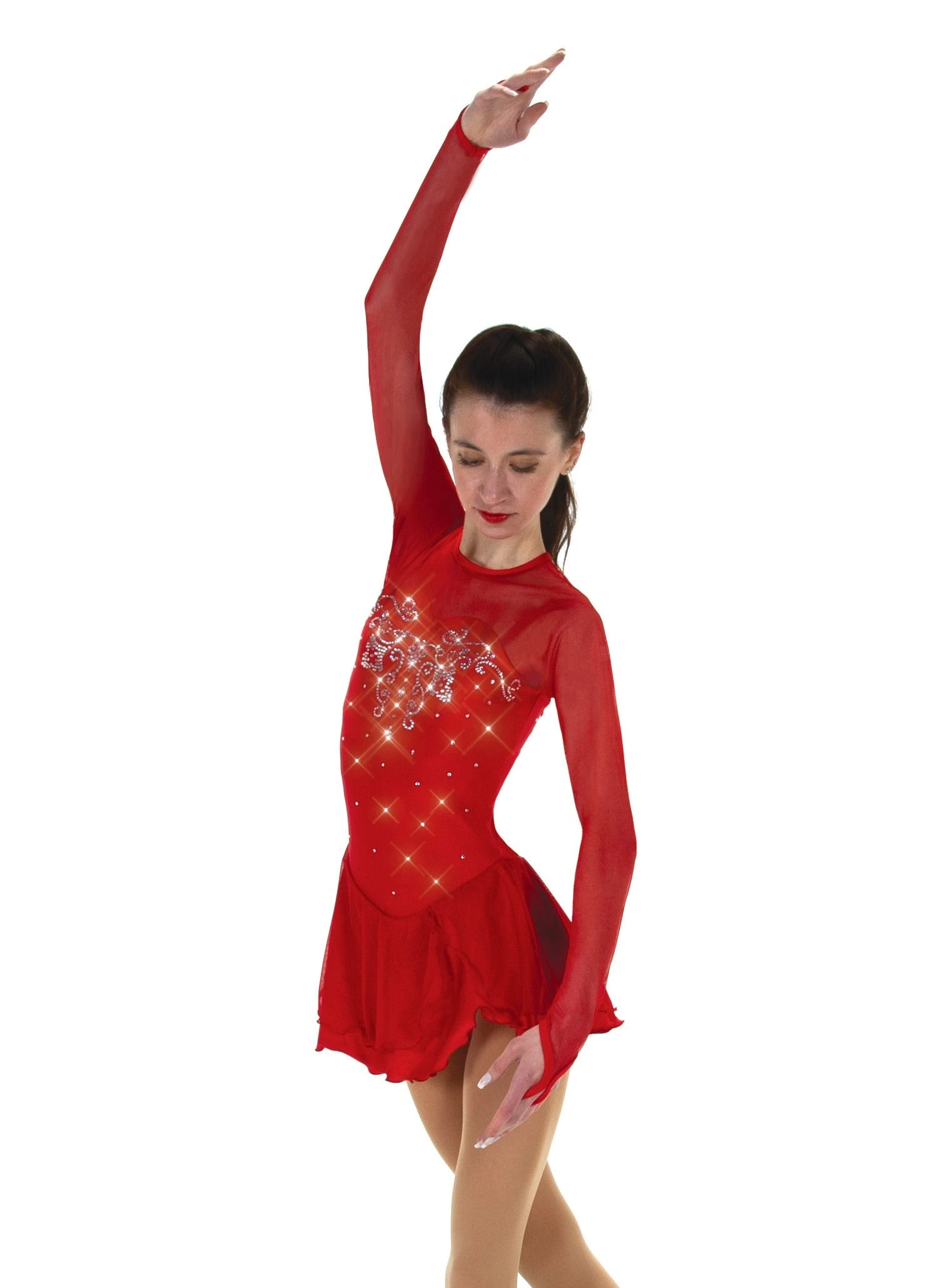 Lycra skating dress, double layer skirt, mesh sleeves with finger points. Lined. Keyhole back.